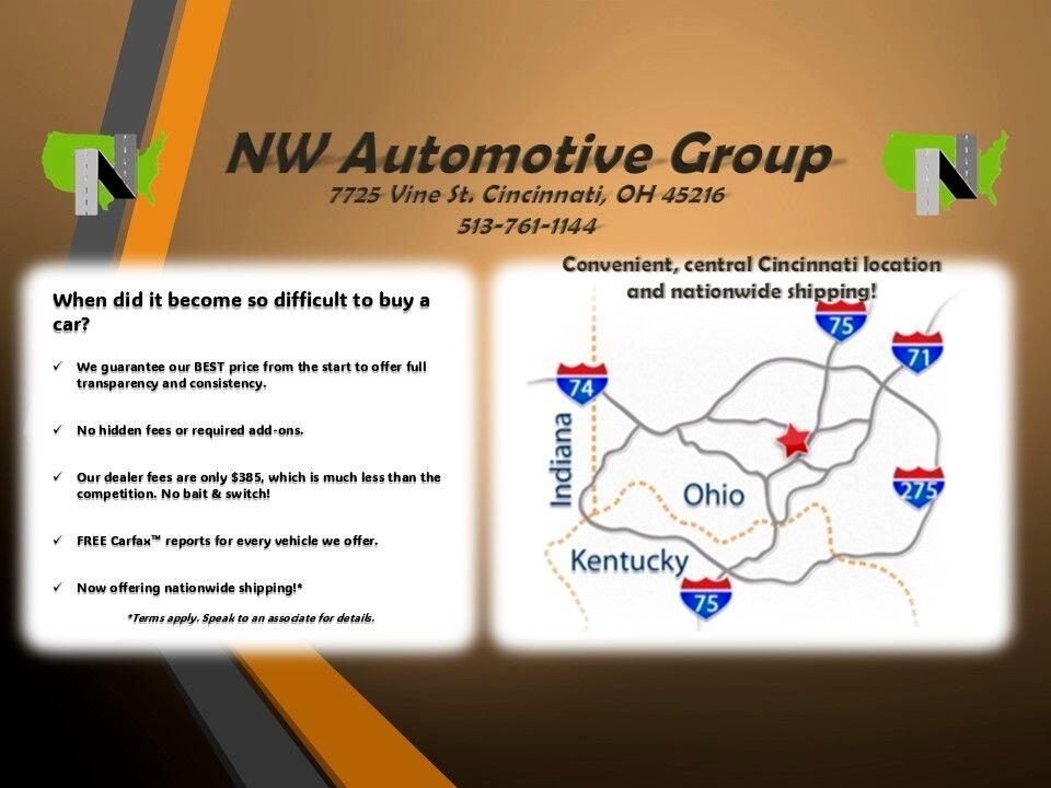 NW Automotive Group takes pride in offering high-quality, pre-owned vehicles. We are conveniently located in the heart of Cincinnati, just minutes of I-75. Our transparent pricing policy ensures that you receive the best possible deal, with significant discounts already applied. Purchasing from us is straightforward: you can pay in cash or allow our skilled business managers to secure the optimal financing rate through our network of lending partners. We have established partnerships with leading institutions such as Capital One, Santander, Exeter, Kemba CU, Sharefax CU and more. Contact us to verify if we collaborate with your preferred lender. Easily apply through our website for a swift approval process. Thank you for considering NW Automotive Group for your next vehicle acquisition. We offer competitive prices for your current vehicle, bring it in today for a complimentary appraisal. ***Internet special. Advertised price includes a $500 incentive/discount for financing with one of our preferred lenders. Traditional and special financing is available for qualified buyers (subject to approved credit). Please contact us first for availability, as our vehicles sell quickly. Prices are subject to change. Sales Tax, Title, License Fee, Registration Fee, Dealer Documentary Fee, Finance Charges, Emission Testing Fees and Compliance Fees are additional to the advertised price. All options and conditions of the vehicles must be verified with the dealer, any descriptions or options that are listed maybe incorrect due to automatic data transfer. Please contact a dealer for more details.